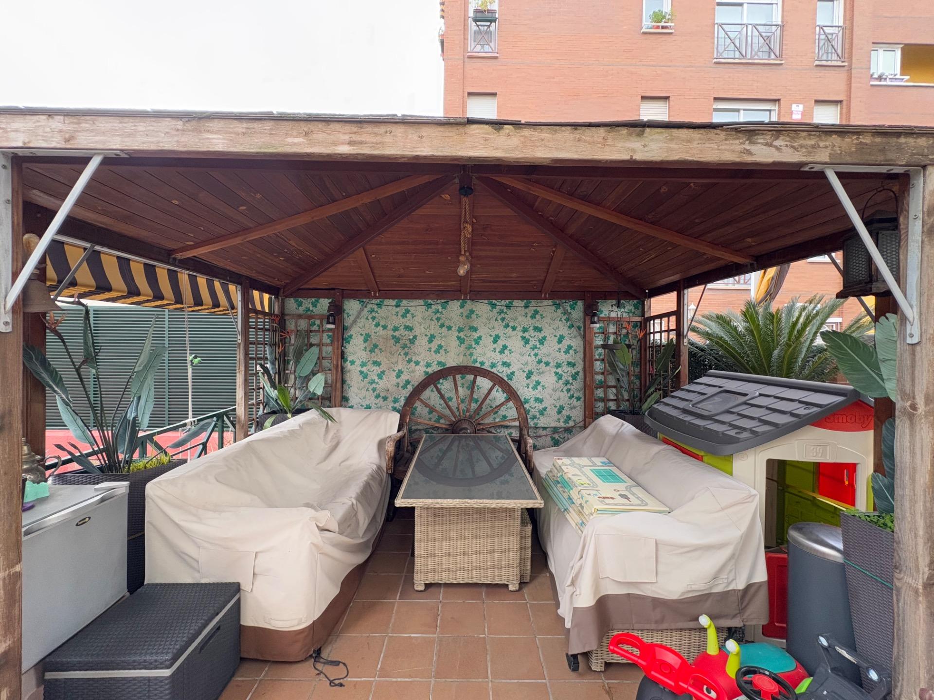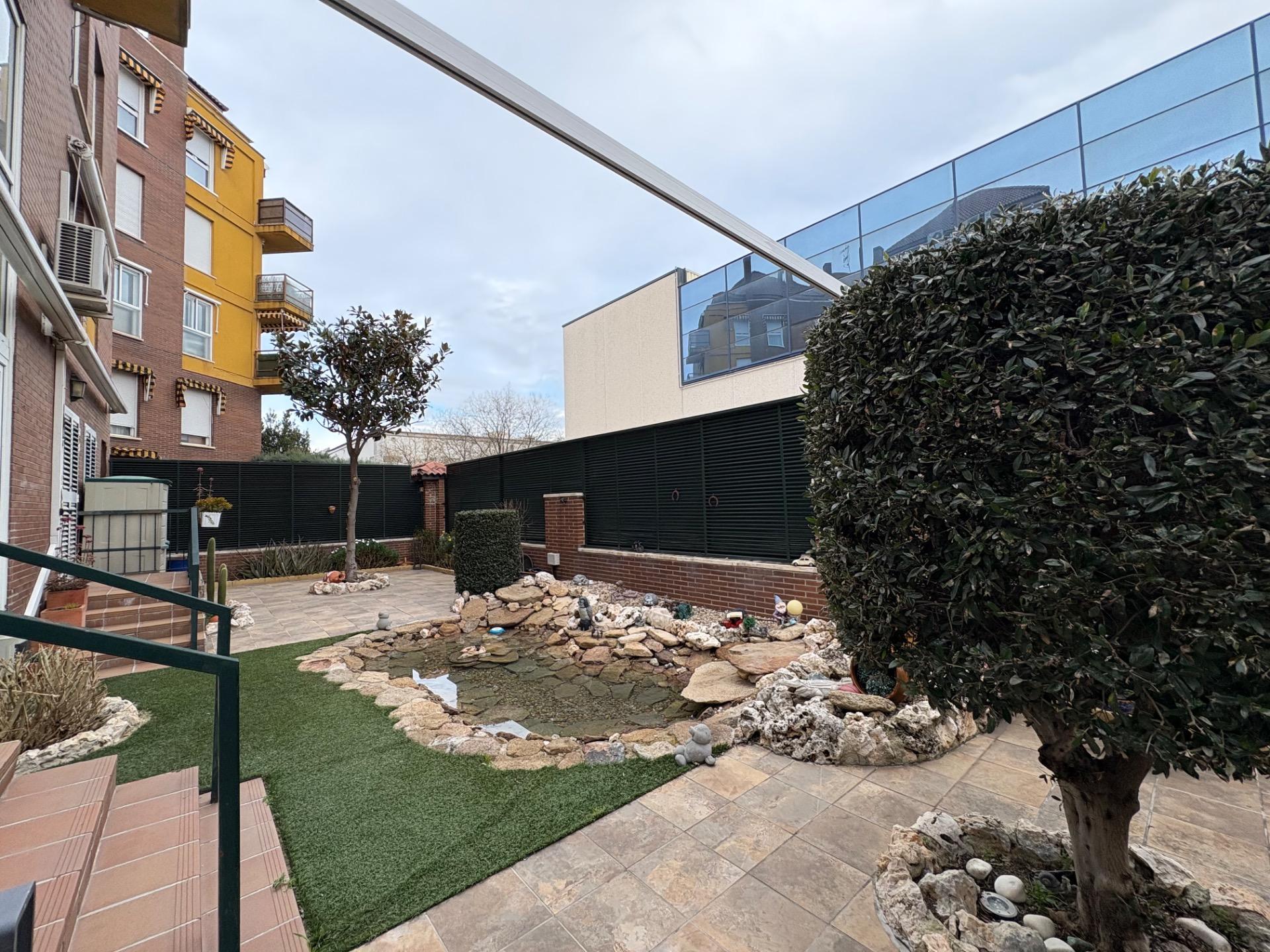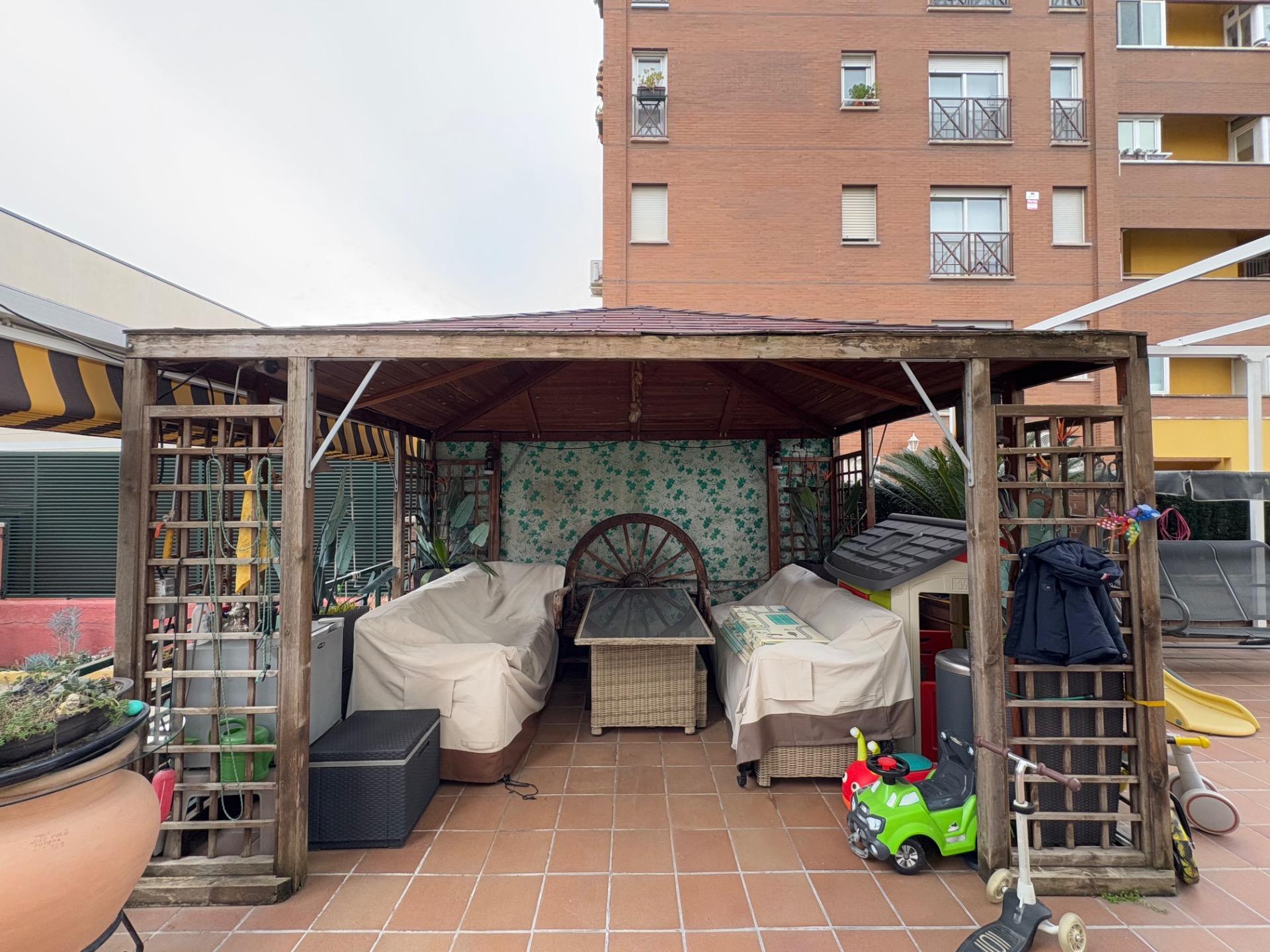 , En esta terraza, se encuentra un pequeño estanque que aporta un toque de tranquilidad, un cenador para disfrutar de las comidas al aire libre, una zona de sofás para relajarse, y un área de almacenamiento, entre otras comodidades.,