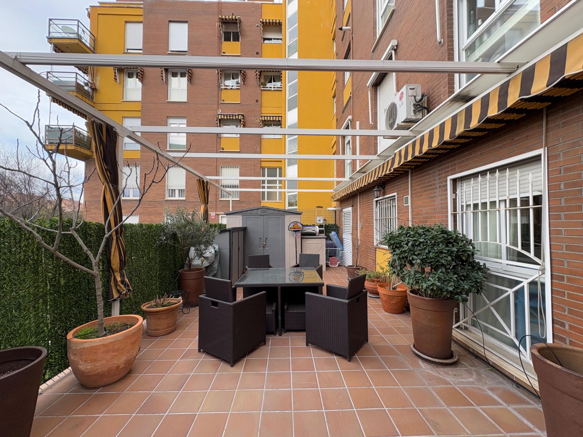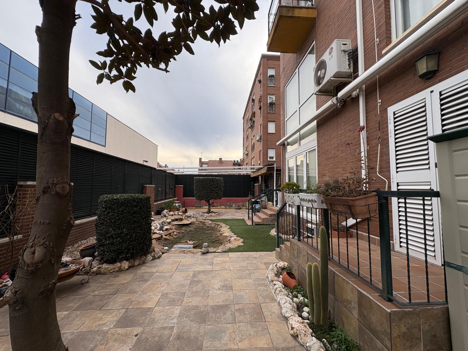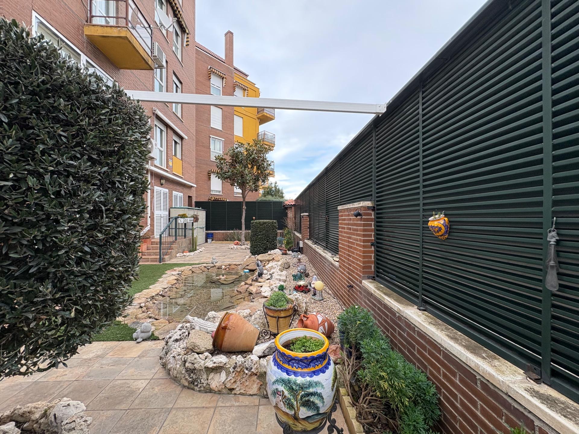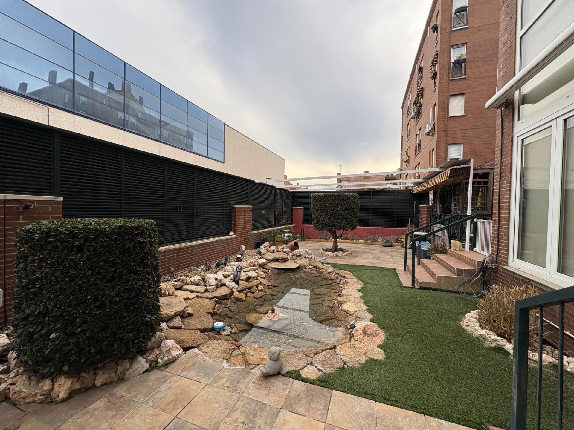 , En esta terraza, se encuentra un pequeño estanque que aporta un toque de tranquilidad, un cenador para disfrutar de las comidas al aire libre, una zona de sofás para relajarse, y un área de almacenamiento, entre otras comodidades.,